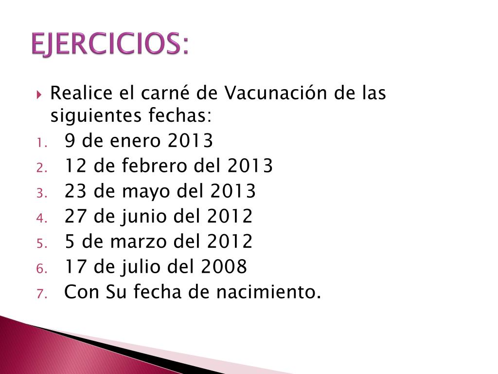 EJERCICIOS: • Realice el carné de Vacunación de las siguientes fechas: • 9 de enero 2013 • 12 de febrero del 2013 • 23 de mayo del 2013 • 27 de junio del 2012 • 5 de marzo del 2012 • 17 de julio del 2008 • Con Su fecha de nacimiento.