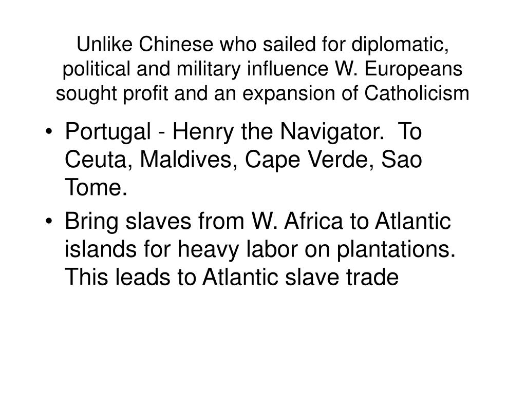 Unlike Chinese who sailed for diplomatic, political and military influence W. Europeans sought profit and an expansion of Catholicism • Portugal - Henry the Navigator. To Ceuta, Maldives, Cape Verde, Sao Tome. • Bring slaves from W. Africa to Atlantic islands for heavy labor on plantations. This leads to Atlantic slave trade