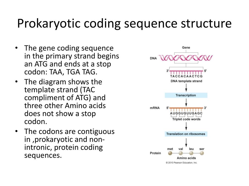 Prokaryotic coding sequence structure • The gene coding sequence in the primary strand begins an ATG and ends at a stop codon: TAA, TGA TAG. • The diagram shows the template strand (TAC compliment of ATG) and three other Amino acids does not show a stop codon. • The codons are contiguous in ,prokaryotic and non-intronic, protein coding sequences.