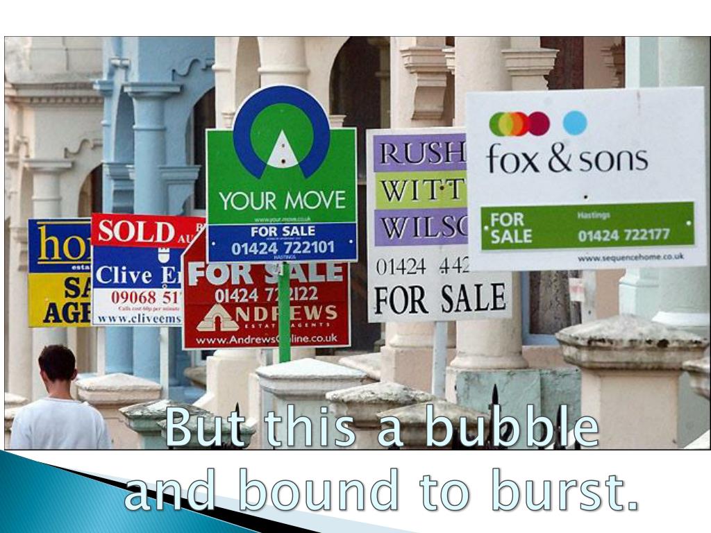 “Flipping” • The process of buying houses simply to sell them again at a profit, is called “flipping.” • If the bank thinks this is what you are going to do, then they are less concerned about your long-term ability to pay off the loan. • This only works as long as house prices are rising steeply. • It all depends on confidence, because the real housing market is a secondary factor (i.e. people want to live in them) But this a bubble and bound to burst.