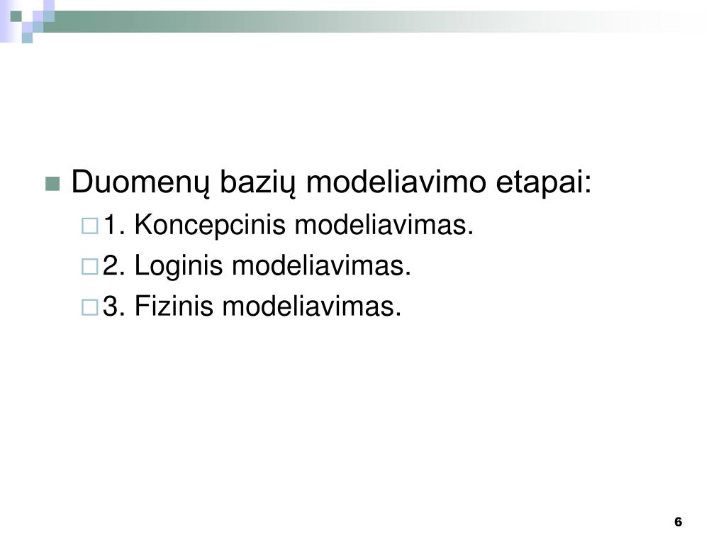 Duomenų bazių modeliavimo etapai: • 1. Koncepcinis modeliavimas. • 2. Loginis modeliavimas. • 3. Fizinis modeliavimas.