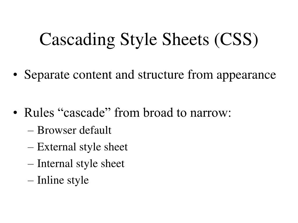 Cascading Style Sheets (CSS) • Separate content and structure from appearance • Rules “cascade” from broad to narrow: • Browser default • External style sheet • Internal style sheet • Inline style