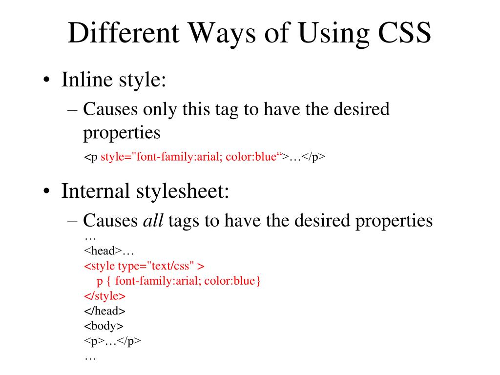 Different Ways of Using CSS • Inline style: • Causes only this tag to have the desired properties • Internal stylesheet: • Causes all tags to have the desired properties <p style="font-family:arial; color:blue“>…</p> … <head>… <style type="text/css" > p { font-family:arial; color:blue} </style> </head> <body> <p>…</p> …