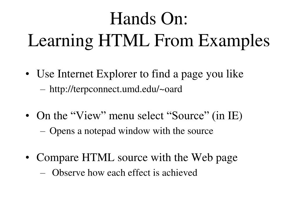 Hands On:Learning HTML From Examples • Use Internet Explorer to find a page you like • http://terpconnect.umd.edu/~oard • On the “View” menu select “Source” (in IE) • Opens a notepad window with the source • Compare HTML source with the Web page • Observe how each effect is achieved