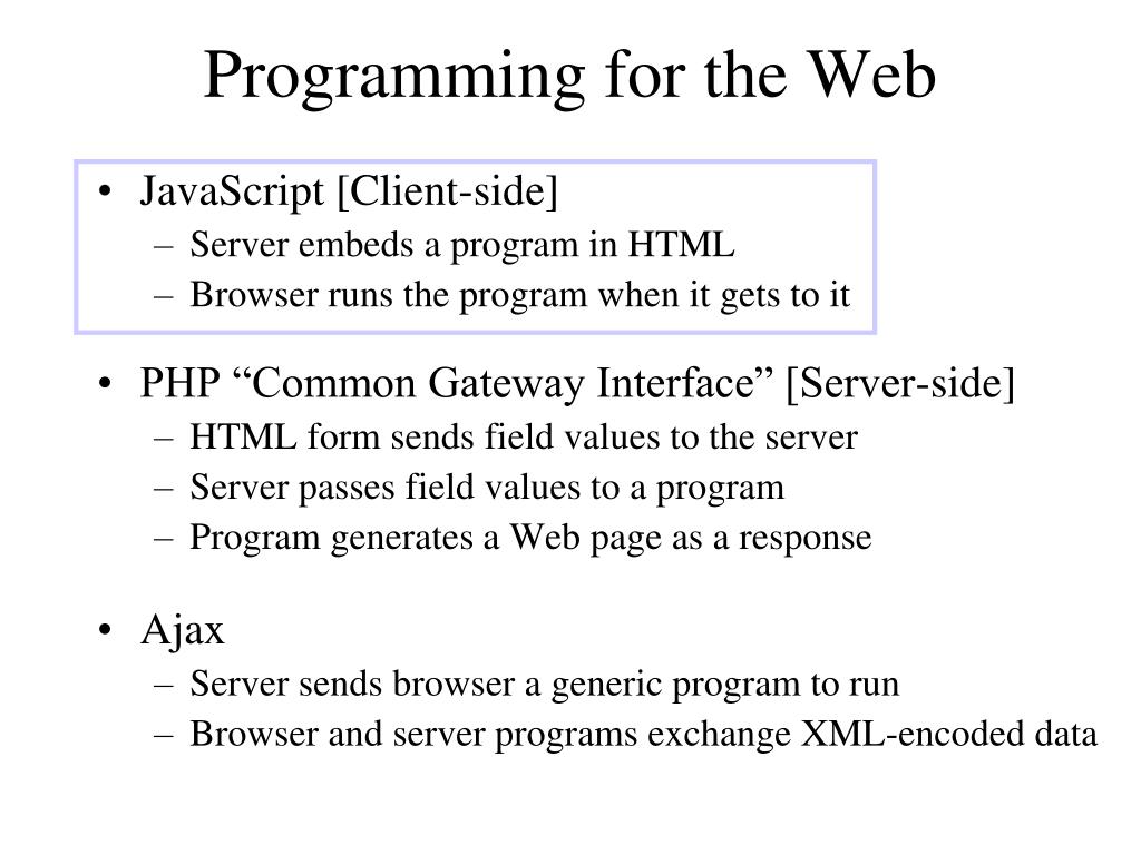 Programming for the Web • JavaScript [Client-side] • Server embeds a program in HTML • Browser runs the program when it gets to it • PHP “Common Gateway Interface” [Server-side] • HTML form sends field values to the server • Server passes field values to a program • Program generates a Web page as a response • Ajax • Server sends browser a generic program to run • Browser and server programs exchange XML-encoded data