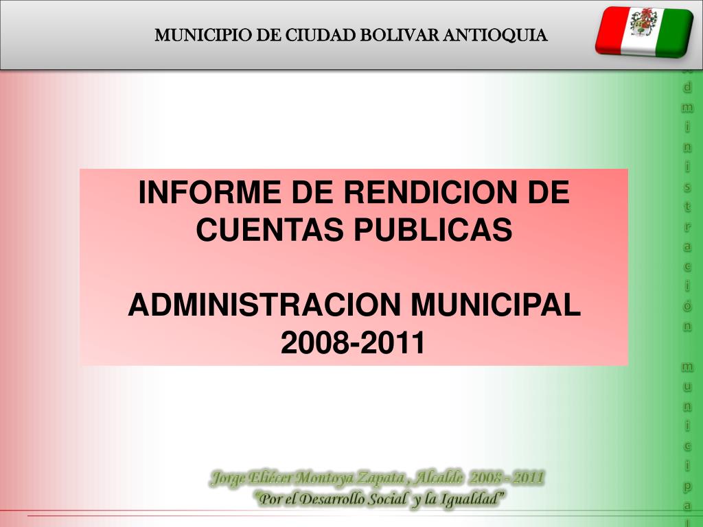 MUNICIPIO DE CIUDAD BOLIVAR ANTIOQUIA. Administración municipal. INFORME DE RENDICION DE CUENTAS PUBLICAS ADMINISTRACION MUNICIPAL 2008-2011. Jorge Eliécer Montoya Zapata , Alcalde 2008 - 2011 “ Por el Desarrollo Social y la Igualdad”. MUNICIPIO DE CIUDAD BOLIVAR ANTIOQUIA.