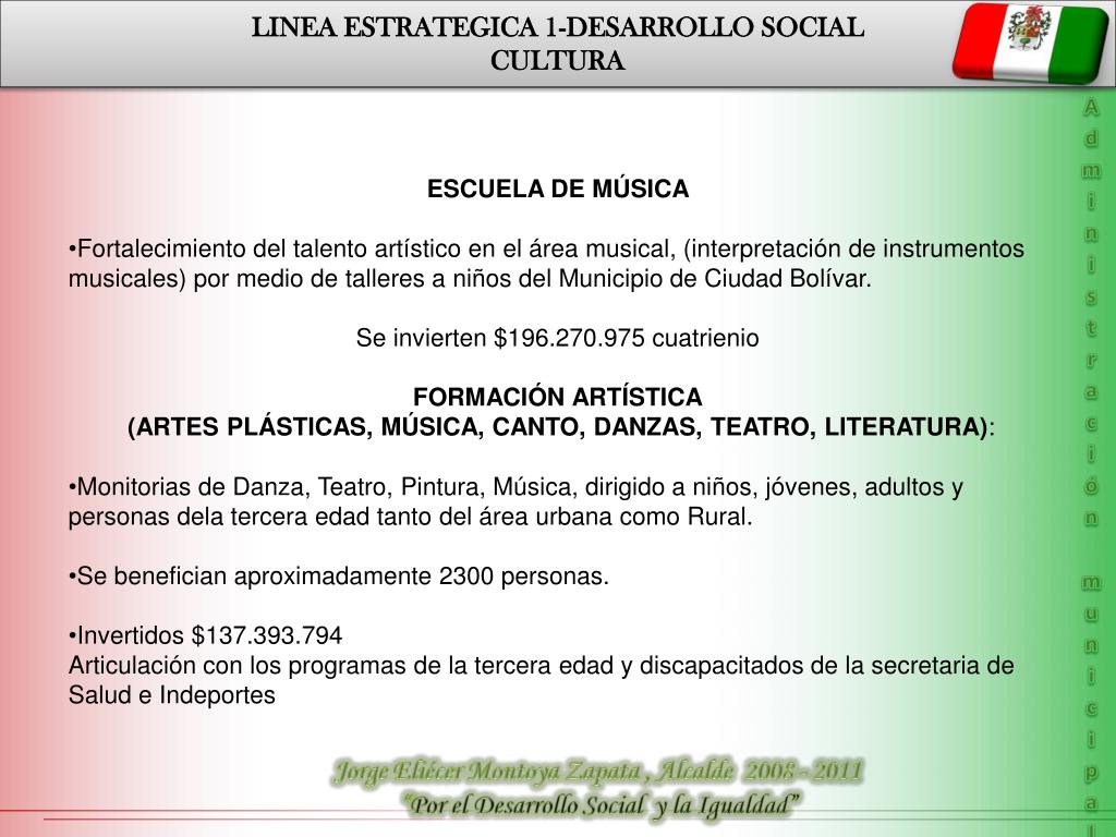LINEA ESTRATEGICA 1-DESARROLLO SOCIAL CULTURA Administración municipal • ESCUELA DE MÚSICA • Fortalecimiento del talento artístico en el área musical, (interpretación de instrumentos musicales) por medio de talleres a niños del Municipio de Ciudad Bolívar. • Se invierten $196.270.975 cuatrienio • FORMACIÓN ARTÍSTICA • (ARTES PLÁSTICAS, MÚSICA, CANTO, DANZAS, TEATRO, LITERATURA): • Monitorias de Danza, Teatro, Pintura, Música, dirigido a niños, jóvenes, adultos y personas dela tercera edad tanto del área urbana como Rural. • Se benefician aproximadamente 2300 personas. • Invertidos $137.393.794 • Articulación con los programas de la tercera edad y discapacitados de la secretaria de Salud e Indeportes Jorge Eliécer Montoya Zapata , Alcalde 2008 - 2011 “Por el Desarrollo Social y la Igualdad”