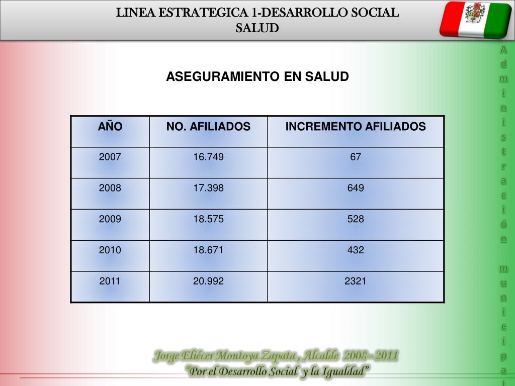 LINEA ESTRATEGICA 1-DESARROLLO SOCIAL SALUD Administración municipal ASEGURAMIENTO EN SALUD Jorge Eliécer Montoya Zapata , Alcalde 2008 - 2011 “Por el Desarrollo Social y la Igualdad”