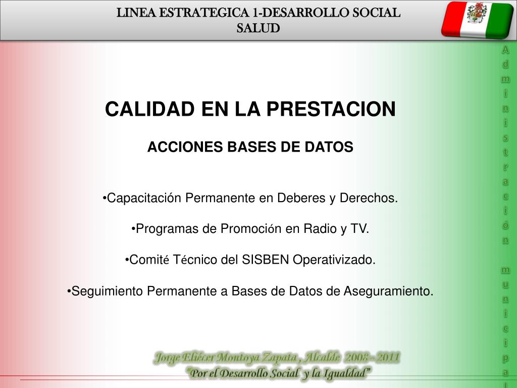 LINEA ESTRATEGICA 1-DESARROLLO SOCIAL SALUD Administración municipal • CALIDAD EN LA PRESTACION • ACCIONES BASES DE DATOS • Capacitación Permanente en Deberes y Derechos. • Programas de Promoción en Radio y TV. • Comité Técnico del SISBEN Operativizado. • Seguimiento Permanente a Bases de Datos de Aseguramiento. Jorge Eliécer Montoya Zapata , Alcalde 2008 - 2011 “Por el Desarrollo Social y la Igualdad”