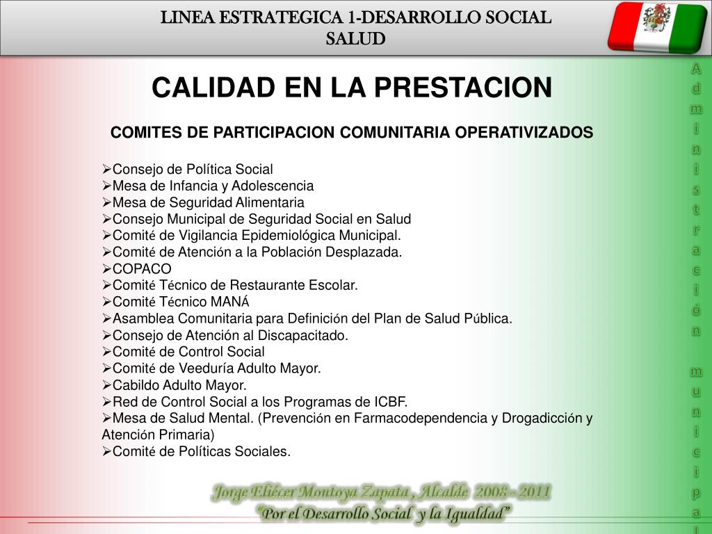 LINEA ESTRATEGICA 1-DESARROLLO SOCIAL SALUD • CALIDAD EN LA PRESTACION • COMITES DE PARTICIPACION COMUNITARIA OPERATIVIZADOS • Consejo de Política Social • Mesa de Infancia y Adolescencia • Mesa de Seguridad Alimentaria • Consejo Municipal de Seguridad Social en Salud • Comité de Vigilancia Epidemiológica Municipal. • Comité de Atención a la Población Desplazada. • COPACO • Comité Técnico de Restaurante Escolar. • Comité Técnico MANÁ • Asamblea Comunitaria para Definición del Plan de Salud Pública. • Consejo de Atención al Discapacitado. • Comité de Control Social • Comité de Veeduría Adulto Mayor. • Cabildo Adulto Mayor. • Red de Control Social a los Programas de ICBF. • Mesa de Salud Mental. (Prevención en Farmacodependencia y Drogadicción y Atención Primaria) • Comité de Políticas Sociales. Administración municipal Jorge Eliécer Montoya Zapata , Alcalde 2008 - 2011 “Por el Desarrollo Social y la Igualdad”