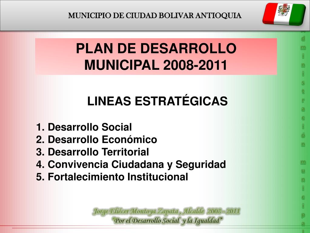 MUNICIPIO DE CIUDAD BOLIVAR ANTIOQUIA Administración municipal PLAN DE DESARROLLO MUNICIPAL 2008-2011 • LINEAS ESTRATÉGICAS • Desarrollo Social • Desarrollo Económico • Desarrollo Territorial • Convivencia Ciudadana y Seguridad • Fortalecimiento Institucional Jorge Eliécer Montoya Zapata , Alcalde 2008 - 2011 “Por el Desarrollo Social y la Igualdad”