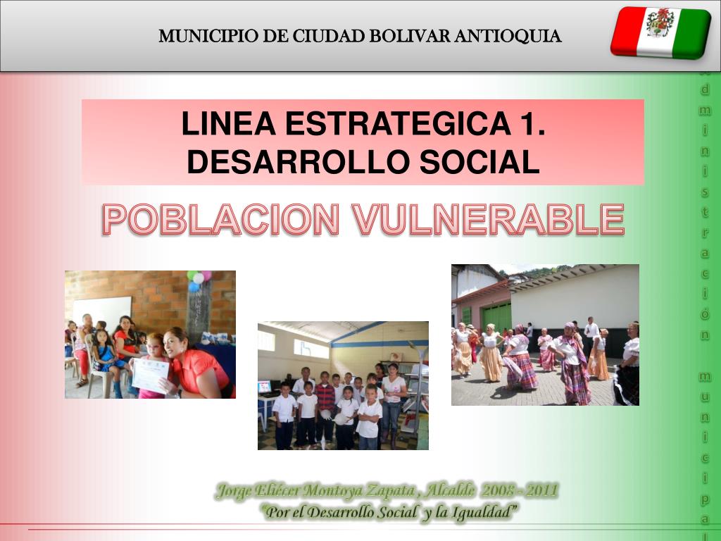 MUNICIPIO DE CIUDAD BOLIVAR ANTIOQUIA Administración municipal LINEA ESTRATEGICA 1. DESARROLLO SOCIAL POBLACION VULNERABLE Jorge Eliécer Montoya Zapata , Alcalde 2008 - 2011 “Por el Desarrollo Social y la Igualdad”