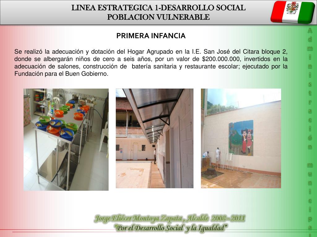 LINEA ESTRATEGICA 1-DESARROLLO SOCIAL POBLACION VULNERABLE PRIMERA INFANCIA Se realizó la adecuación y dotación del Hogar Agrupado en la I.E. San José del Citara bloque 2, donde se albergarán niños de cero a seis años, por un valor de $200.000.000, invertidos en la adecuación de salones, construcción de batería sanitaria y restaurante escolar; ejecutado por la Fundación para el Buen Gobierno. Administración municipal Jorge Eliécer Montoya Zapata , Alcalde 2008 - 2011 “Por el Desarrollo Social y la Igualdad”