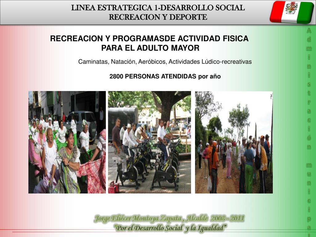 LINEA ESTRATEGICA 1-DESARROLLO SOCIAL RECREACION Y DEPORTE Administración municipal RECREACION Y PROGRAMASDE ACTIVIDAD FISICA PARA EL ADULTO MAYOR Caminatas, Natación, Aeróbicos, Actividades Lúdico-recreativas 2800 PERSONAS ATENDIDAS por año PLAN DE DESARROLLO DEPARTAMENTAL LINEA ESTRATÉGICA 4 DESARROLLO TERRITORIAL PLAN DE DESARROLLO DEPARTAMENTAL LINEA ESTRATÉGICA 4 DESARROLLO TERRITORIAL Jorge Eliécer Montoya Zapata , Alcalde 2008 - 2011 “Por el Desarrollo Social y la Igualdad”