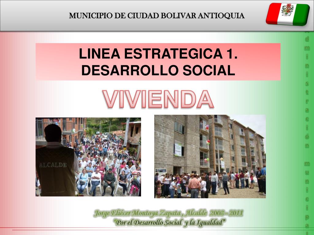MUNICIPIO DE CIUDAD BOLIVAR ANTIOQUIA Administración municipal LINEA ESTRATEGICA 1. DESARROLLO SOCIAL VIVIENDA Jorge Eliécer Montoya Zapata , Alcalde 2008 - 2011 “Por el Desarrollo Social y la Igualdad”