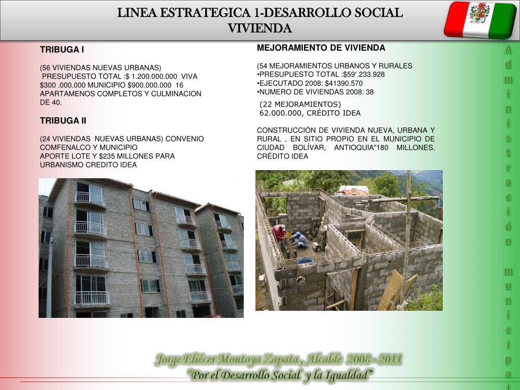LINEA ESTRATEGICA 1-DESARROLLO SOCIAL VIVIENDA • MEJORAMIENTO DE VIVIENDA • (54 MEJORAMIENTOS URBANOS Y RURALES • PRESUPUESTO TOTAL :$59’.233.928 • EJECUTADO 2008: $41390.570 • NUMERO DE VIVIENDAS 2008: 38 TRIBUGA I (56 VIVIENDAS NUEVAS URBANAS) PRESUPUESTO TOTAL :$ 1.200.000.000 VIVA $300 .000.000 MUNICIPIO $900.000.000 16 APARTAMENOS COMPLETOS Y CULMINACION DE 40. TRIBUGA II (24 VIVIENDAS NUEVAS URBANAS) CONVENIO COMFENALCO Y MUNICIPIO APORTE LOTE Y $235 MILLONES PARA URBANISMO CREDITO IDEA Administración municipal (22 MEJORAMIENTOS) 62.000.000, CRÉDITO IDEA CONSTRUCCIÓN DE VIVIENDA NUEVA, URBANA Y RURAL , EN SITIO PROPIO EN EL MUNICIPIO DE CIUDAD BOLÍVAR, ANTIOQUIA"180 MILLONES, CRÉDITO IDEA Jorge Eliécer Montoya Zapata , Alcalde 2008 - 2011 “Por el Desarrollo Social y la Igualdad”