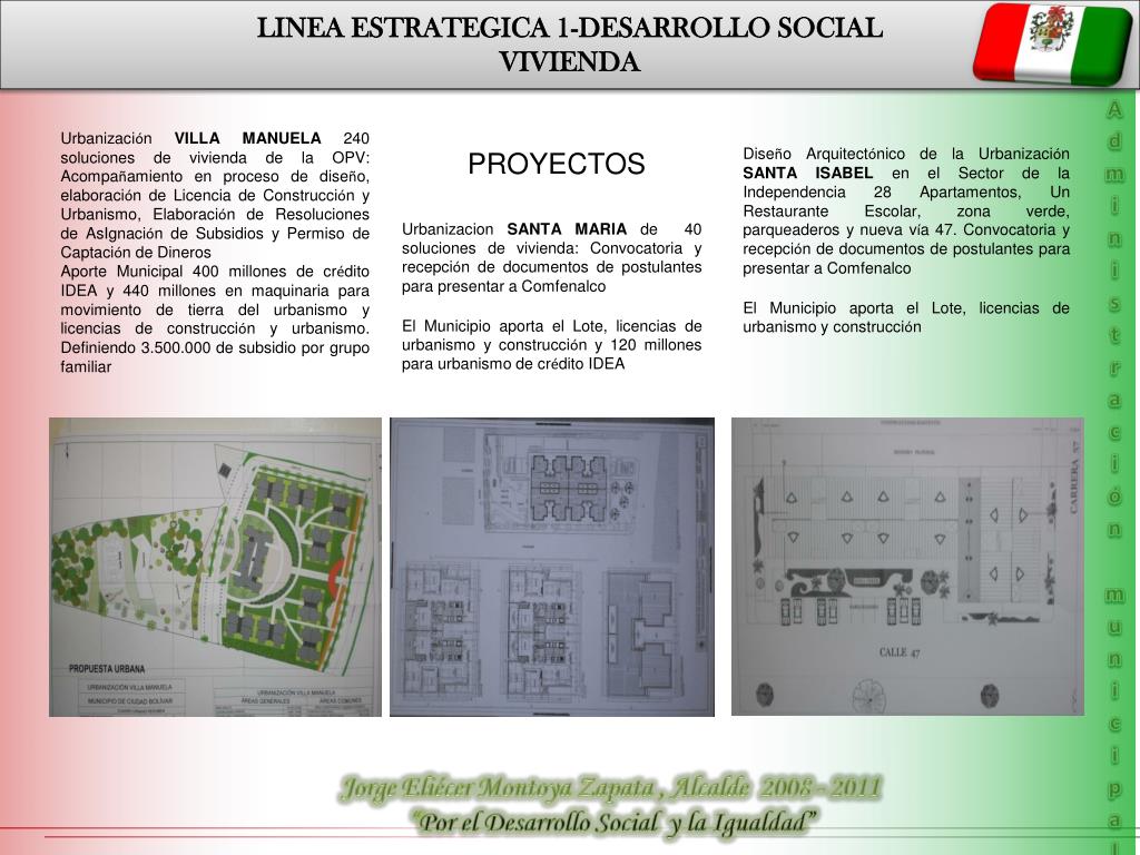 LINEA ESTRATEGICA 1-DESARROLLO SOCIAL VIVIENDA Administración municipal Urbanización VILLA MANUELA 240 soluciones de vivienda de la OPV: Acompañamiento en proceso de diseño, elaboración de Licencia de Construcción y Urbanismo, Elaboración de Resoluciones de AsIgnación de Subsidios y Permiso de Captación de Dineros Aporte Municipal 400 millones de crédito IDEA y 440 millones en maquinaria para movimiento de tierra del urbanismo y licencias de construcción y urbanismo. Definiendo 3.500.000 de subsidio por grupo familiar Diseño Arquitectónico de la Urbanización SANTA ISABEL en el Sector de la Independencia 28 Apartamentos, Un Restaurante Escolar, zona verde, parqueaderos y nueva vía 47. Convocatoria y recepción de documentos de postulantes para presentar a Comfenalco El Municipio aporta el Lote, licencias de urbanismo y construcción PROYECTOS Urbanizacion SANTA MARIA de 40 soluciones de vivienda: Convocatoria y recepción de documentos de postulantes para presentar a Comfenalco El Municipio aporta el Lote, licencias de urbanismo y construcción y 120 millones para urbanismo de crédito IDEA Jorge Eliécer Montoya Zapata , Alcalde 2008 - 2011 “Por el Desarrollo Social y la Igualdad”