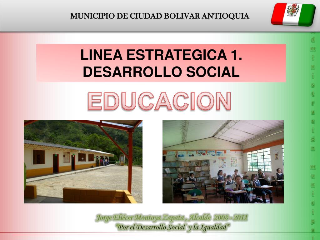 MUNICIPIO DE CIUDAD BOLIVAR ANTIOQUIA Administración municipal LINEA ESTRATEGICA 1. DESARROLLO SOCIAL • COMPONENTES • Educación • Cultura • Salud • Población Vulnerable • Población Indígena y Minorías Étnicas • Recreación y Deporte • Vivienda • Desarrollo Comunitario Jorge Eliécer Montoya Zapata , Alcalde 2008 - 2011 “Por el Desarrollo Social y la Igualdad”
