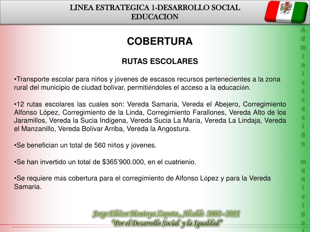 *-++++++++++++++++++++++++++++++++++++++++++++ LINEA ESTRATEGICA 1-DESARROLLO SOCIAL EDUCACION Administración municipal COBERTURA RUTAS ESCOLARES • Transporte escolar para niños y jóvenes de escasos recursos pertenecientes a la zona rural del municipio de ciudad bolívar, permitiéndoles el acceso a la educación. • 12 rutas escolares las cuales son: Vereda Samaria, Vereda el Abejero, Corregimiento Alfonso López, Corregimiento de la Linda, Corregimiento Farallones, Vereda Alto de los Jaramillos, Vereda la Sucia Indígena, Vereda Sucia La María, Vereda La Lindaja, Vereda el Manzanillo, Vereda Bolívar Arriba, Vereda la Angostura. • Se benefician un total de 560 niños y jóvenes. • Se han invertido un total de $365’900.000, en el cuatrienio. • Se requiere más cobertura para el corregimiento de Alfonso López y para la Vereda Samaria. PLAN DE DESARROLLO DEPARTAMENTAL LINEA 1 DESARROLLO POLÍTICO Jorge Eliécer Montoya Zapata , Alcalde 2008 - 2011 “Por el Desarrollo Social y la Igualdad”