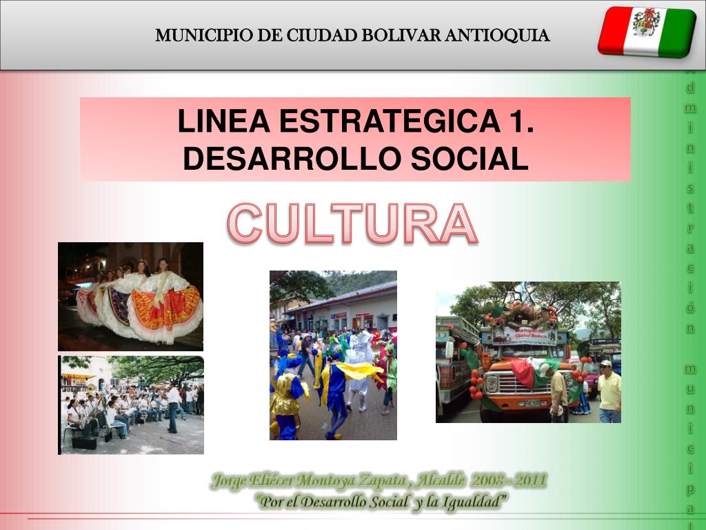 MUNICIPIO DE CIUDAD BOLIVAR ANTIOQUIA Administración municipal LINEA ESTRATEGICA 1. DESARROLLO SOCIAL CULTURA Jorge Eliécer Montoya Zapata , Alcalde 2008 - 2011 “Por el Desarrollo Social y la Igualdad”