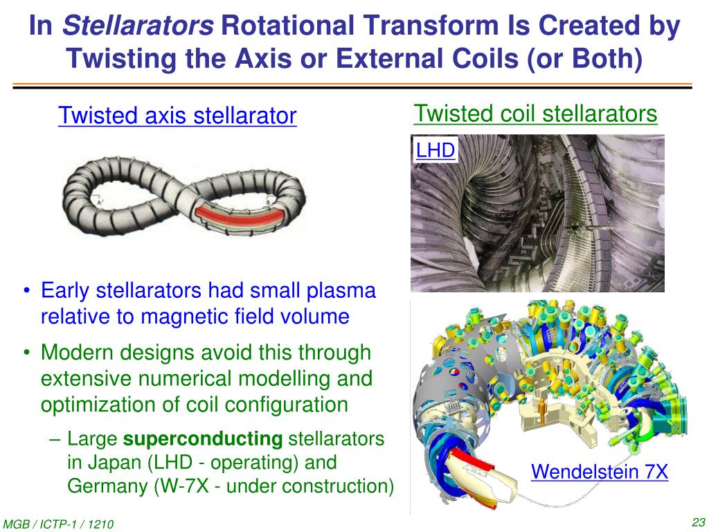 Experiments Around the World Are Investigating and Attempting to Optimize the Magnetic Configuration JET, LargeTokamak – EU C-Mod,Tokamak MIT W7-X, Large Superconducting Stellarator – EU National Spherical Torus Experiment PPPL (also MAST – EU) EAST, SST-1, KSTAR Superconducting Tokamaks, – China, India, Korea JT-60SA, LargeSuperconductingTokamak – JA (2019) LHD, Large Superconducting Stellarator – JA DIII-D, Tokamak General Atomics