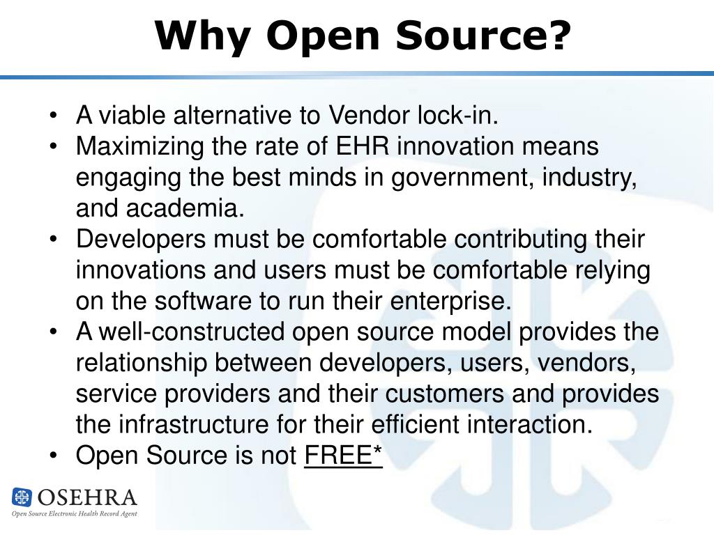 Why Open Source? A viable alternative to Vendor lock-in. Maximizing the rate of EHR innovation means engaging the best minds in government, industry, and academia. Developers must be comfortable contributing their innovations and users must be comfortable relying on the software to run their enterprise. A well-constructed open source model provides the relationship between developers, users, vendors, service providers and their customers and provides the infrastructure for their efficient interaction. Open Source is not FREE*