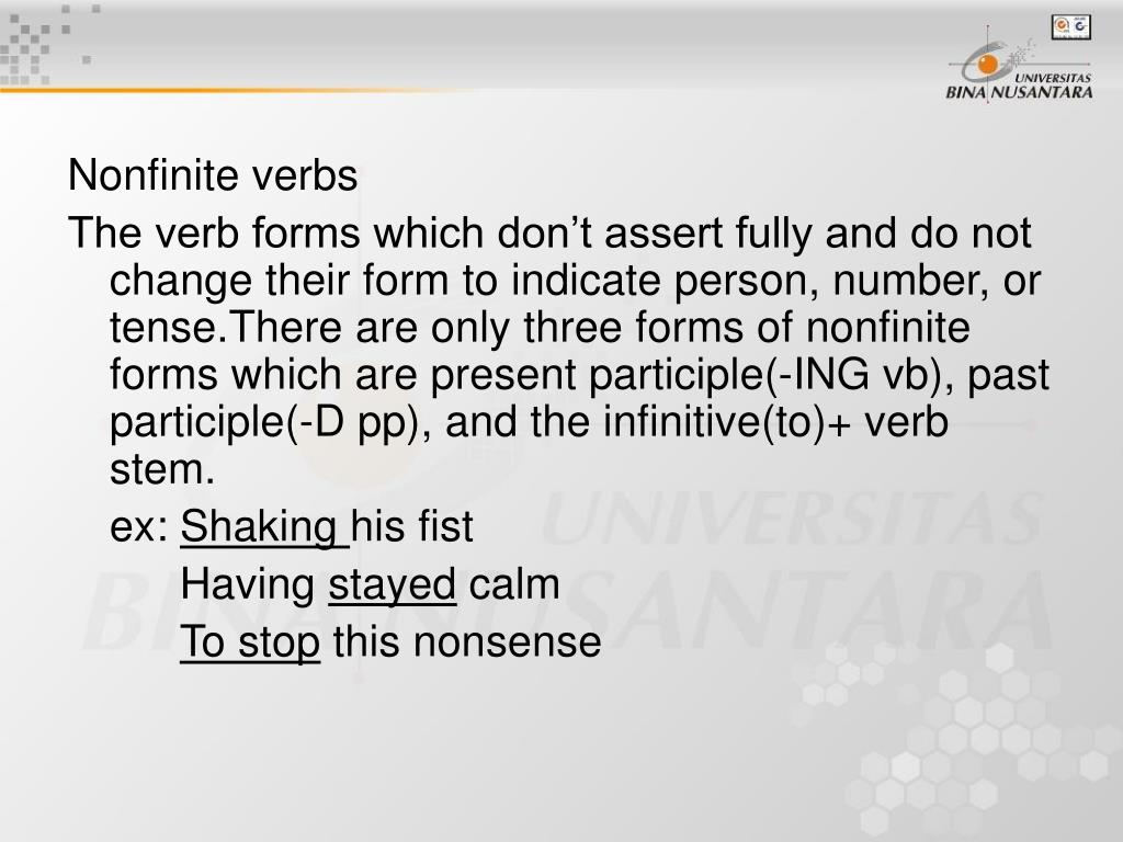 Nonfinite verbs The verb forms which don’t assert fully and do not change their form to indicate person, number, or tense.There are only three forms of nonfinite forms which are present participle(-ING vb), past participle(-D pp), and the infinitive(to)+ verb stem. ex: Shaking his fist Having stayed calm To stop this nonsense