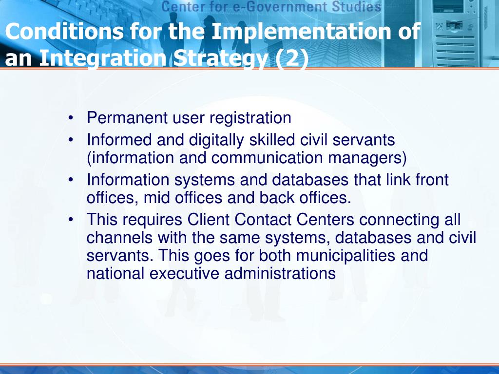 Conditions for the Implementation of an Integration Strategy (2) • Permanent user registration • Informed and digitally skilled civil servants (information and communication managers) • Information systems and databases that link front offices, mid offices and back offices. • This requires Client Contact Centers connecting all channels with the same systems, databases and civil servants. This goes for both municipalities and national executive administrations
