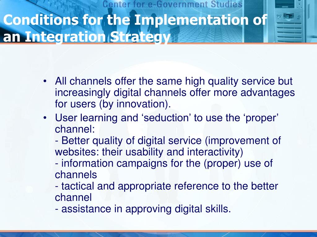 Conditions for the Implementation of an Integration Strategy • All channels offer the same high quality service but increasingly digital channels offer more advantages for users (by innovation). • User learning and ‘seduction’ to use the ‘proper’ channel:- Better quality of digital service (improvement of websites: their usability and interactivity) - information campaigns for the (proper) use of channels - tactical and appropriate reference to the better channel- assistance in approving digital skills.