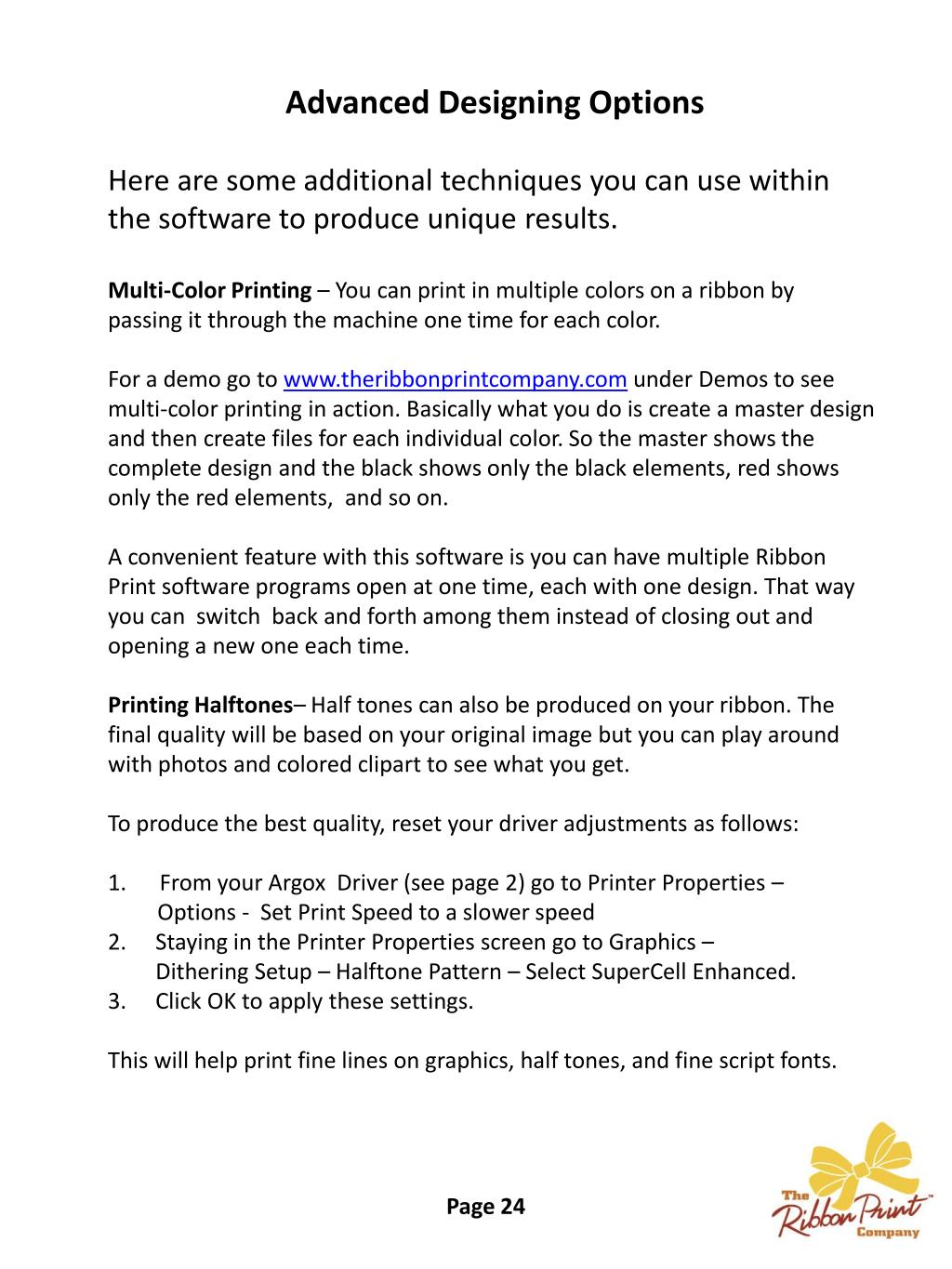 Advanced Designing Options Here are some additional techniques you can use within the software to produce unique results. Multi-Color Printing – You can print in multiple colors on a ribbon by passing it through the machine one time for each color. For a demo go to www.theribbonprintcompany.com under Demos to see multi-color printing in action. Basically what you do is create a master design and then create files for each individual color. So the master shows the complete design and the black shows only the black elements, red shows only the red elements, and so on. A convenient feature with this software is you can have multiple Ribbon Print software programs open at one time, each with one design. That way you can switch back and forth among them instead of closing out and opening a new one each time. Printing Halftones– Half tones can also be produced on your ribbon. The final quality will be based on your original image but you can play around with photos and colored clipart to see what you get. To produce the best quality, reset your driver adjustments as follows: 1. From your Argox Driver (see page 2) go to Printer Properties – Options - Set Print Speed to a slower speed Staying in the Printer Properties screen go to Graphics – Dithering Setup – Halftone Pattern – Select SuperCell Enhanced. Click OK to apply these settings. This will help print fine lines on graphics, half tones, and fine script fonts. Page 24