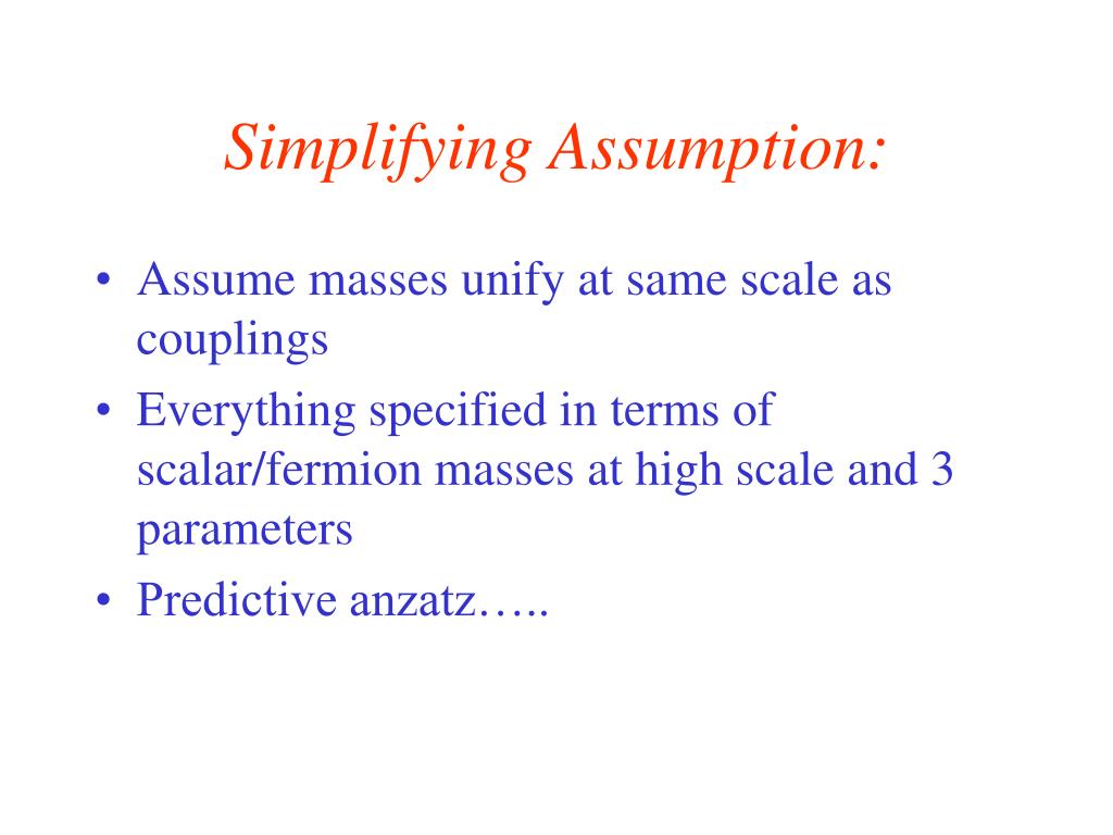 Simplifying Assumption: • Assume masses unify at same scale as couplings • Everything specified in terms of scalar/fermion masses at high scale and 3 parameters • Predictive anzatz…..
