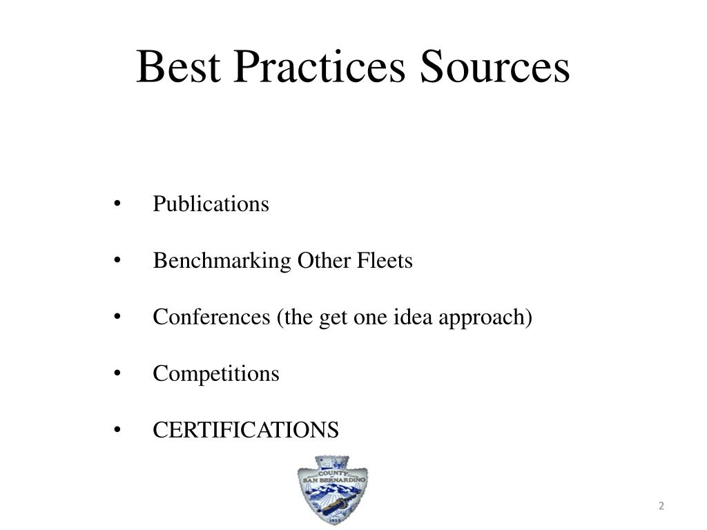 Best Practices Sources • Publications • Benchmarking Other Fleets • Conferences (the get one idea approach) • Competitions • CERTIFICATIONS