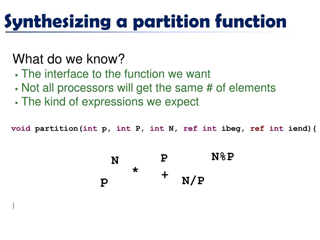 Synthesizing a partition function • What do we know? • The interface to the function we want • Not all processors will get the same # of elements • The kind of expressions we expect void partition(int p, int P, int N, refintibeg, refintiend){ if(p< expr({p, P, N, N/P, N%P},{PLUS,TIMES})){ iend = expr({p, P, N, N/P, N%P},{PLUS,TIMES}); ibeg = expr({p, P, N, N/P, N%P},{PLUS,TIMES}); }else{ iend = expr({p, P, N, N/P, N%P},{PLUS,TIMES}); ibeg = expr({p, P, N, N/P, N%P},{PLUS,TIMES}); } } * + N%P P N p N/P