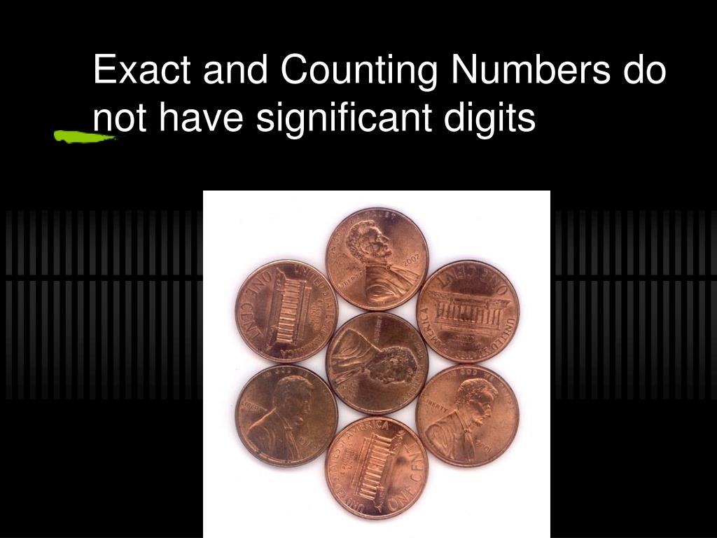 Sig Figs • Only measurements have sig figs. • Counted numbers are exact • Ex: • A dozen is exactly 12 • Number of students in this classroom • Unit conversions in most cases will be considered exact numbers • Ex: • 1 milliliter is exactly .001 of a liter • 100 centimeters is exactly 1 meter