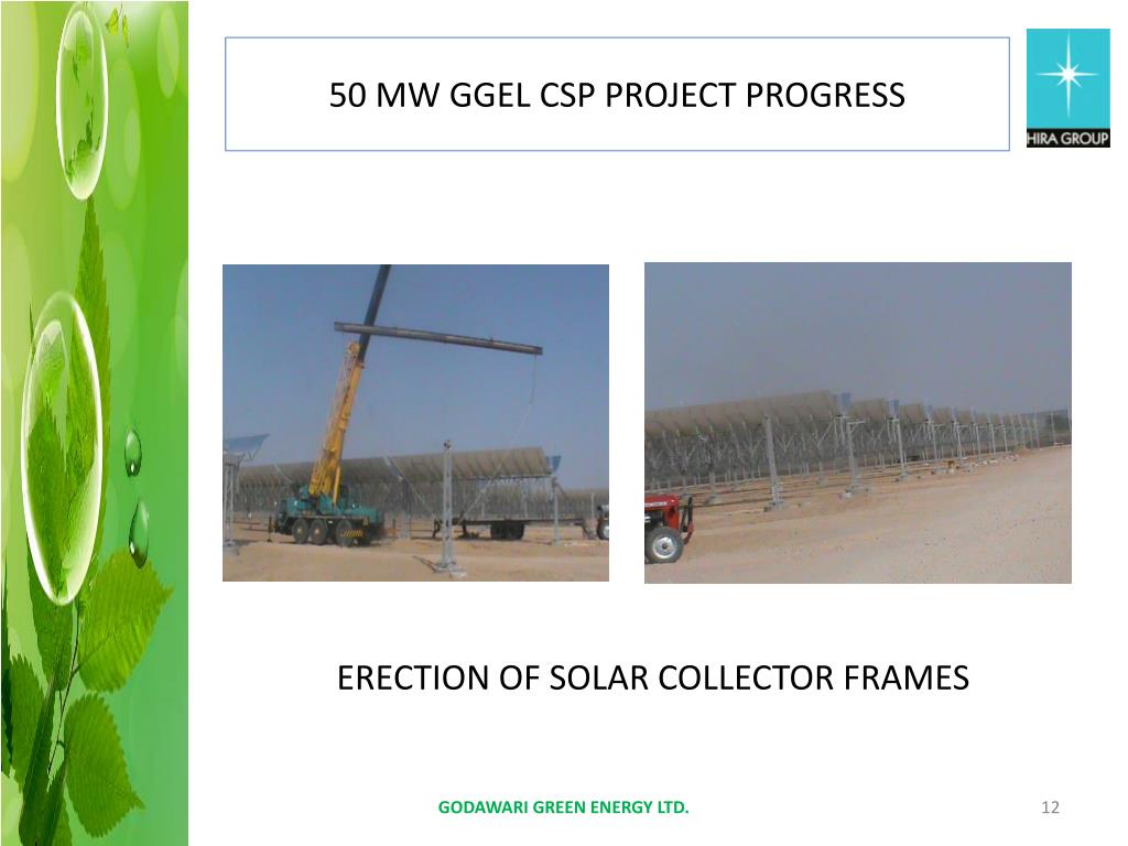 50 MW GGEL CSP PROJECT PROGRESS LAND AQUISITION: Completed in 3 months on 24th May 2011 from Government of Rajasthan (400 Acres) CLEARANCES : Water allotment, Transmission agreement, Consent to Establish, ROW for Raw water pipeline, Layout Approval from Government of Rajasthan with in 6 months by 16th July 2011. EPC CONTRACT : Signed with Lauren on 20th August 2011 SITE PROGRESS : a. 100% Engineering Completed (as on 31st October 2012) b. 95% Procurement Completed c. 45% Construction Completed d. 95% Civil work completed e. 100% of HTF line erected f. 60% of Solar frames received at site g. 11% of Solar frames erected h. Major Components like SG, mirrors, HCE tubes on site & STG reaching port on 10th November 2012. COMMISIONING: Expected With in the given time frame (9.05.13) GODAWARI GREEN ENERGY LTD.