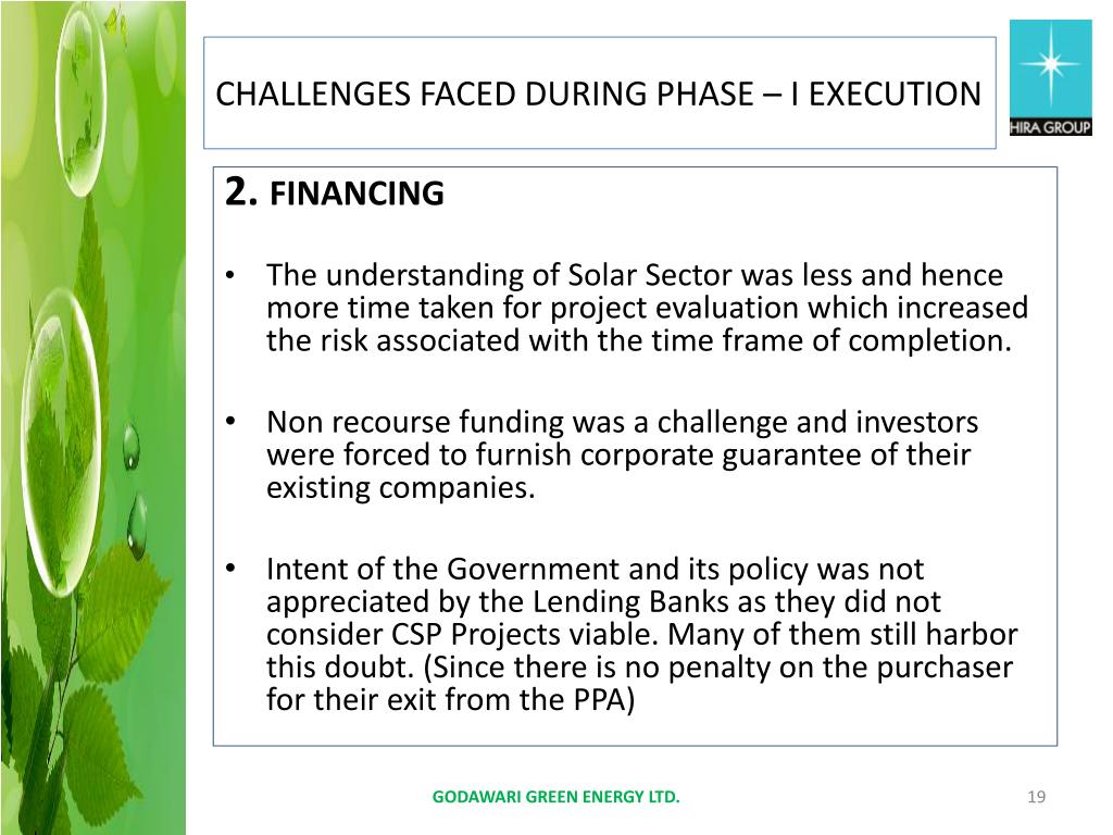 CHALLENGES FACED DURING PHASE – I EXECUTION 2. FINANCING • The understanding of Solar Sector was less and hence more time taken for project evaluation which increased the risk associated with the time frame of completion. • Non recourse funding was a challenge and investors were forced to furnish corporate guarantee of their existing companies. • Intent of the Government and its policy was not appreciated by the Lending Banks as they did not consider CSP Projects viable. Many of them still harbor this doubt. (Since there is no penalty on the purchaser for their exit from the PPA) GODAWARI GREEN ENERGY LTD.