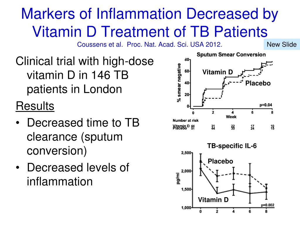 Markers of Inflammation Decreased by Vitamin D Treatment of TB Patients Coussens et al. Proc. Nat. Acad. Sci. USA 2012. New Slide Clinical trial with high-dose vitamin D in 146 TB patients in London Results • Decreased time to TB clearance (sputum conversion) • Decreased levels of inflammation Vitamin D Placebo TB-specific IL-6 Placebo Vitamin D