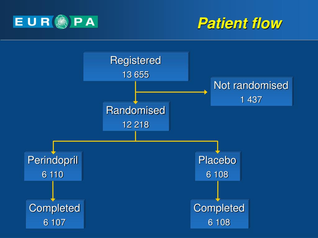 Registered 13 655 Not randomised 1 437 Randomised 12 218 Perindopril 6 110 Placebo 6 108 Completed 6 108 Completed 6 107 Patient flow
