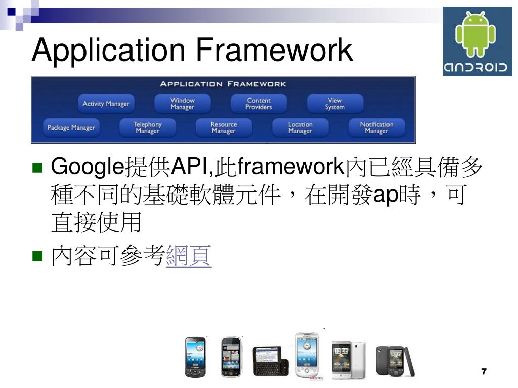 Application Framework • Google提供API,此framework內已經具備多種不同的基礎軟體元件,在開發ap時,可直接使用 • 內容可參考網頁