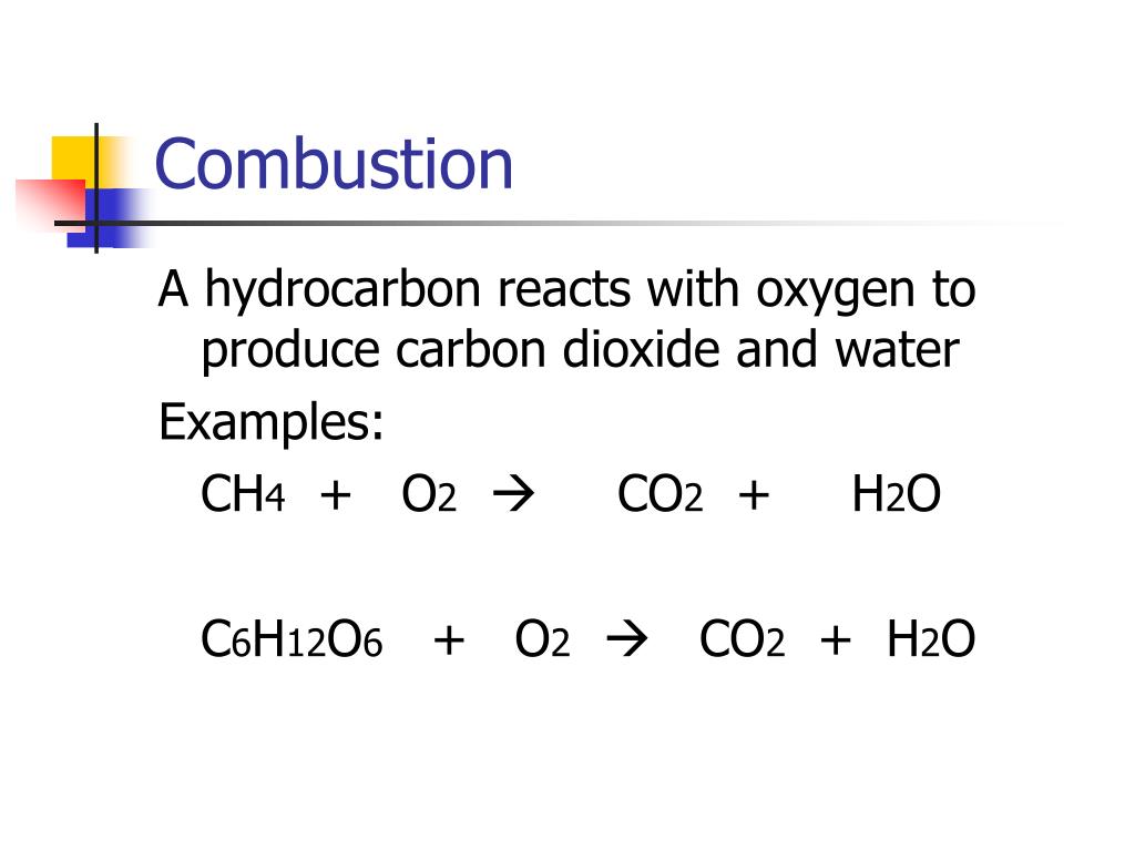 Combustion A hydrocarbon reacts with oxygen to produce carbon dioxide and water Examples: CH4 + O2 CO2 + H2O C6H12O6 + O2 CO2 + H2O