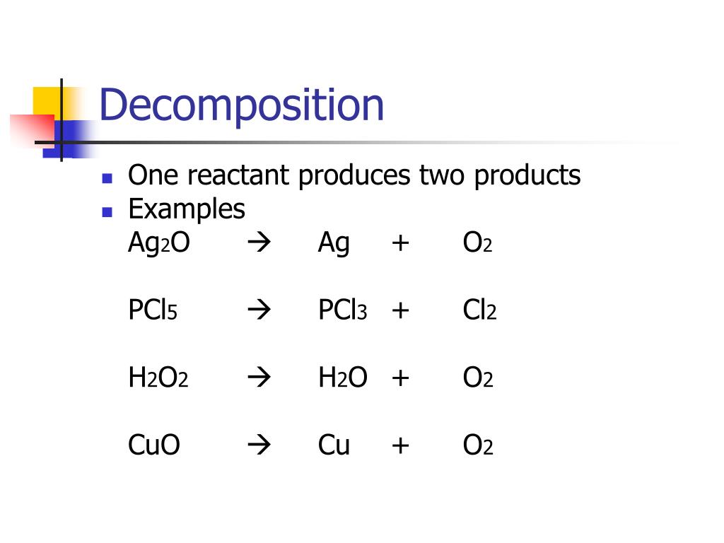 Decomposition • One reactant produces two products • Examples Ag2O Ag + O2 PCl5 PCl3 + Cl2 H2O2 H2O + O2 CuO Cu + O2