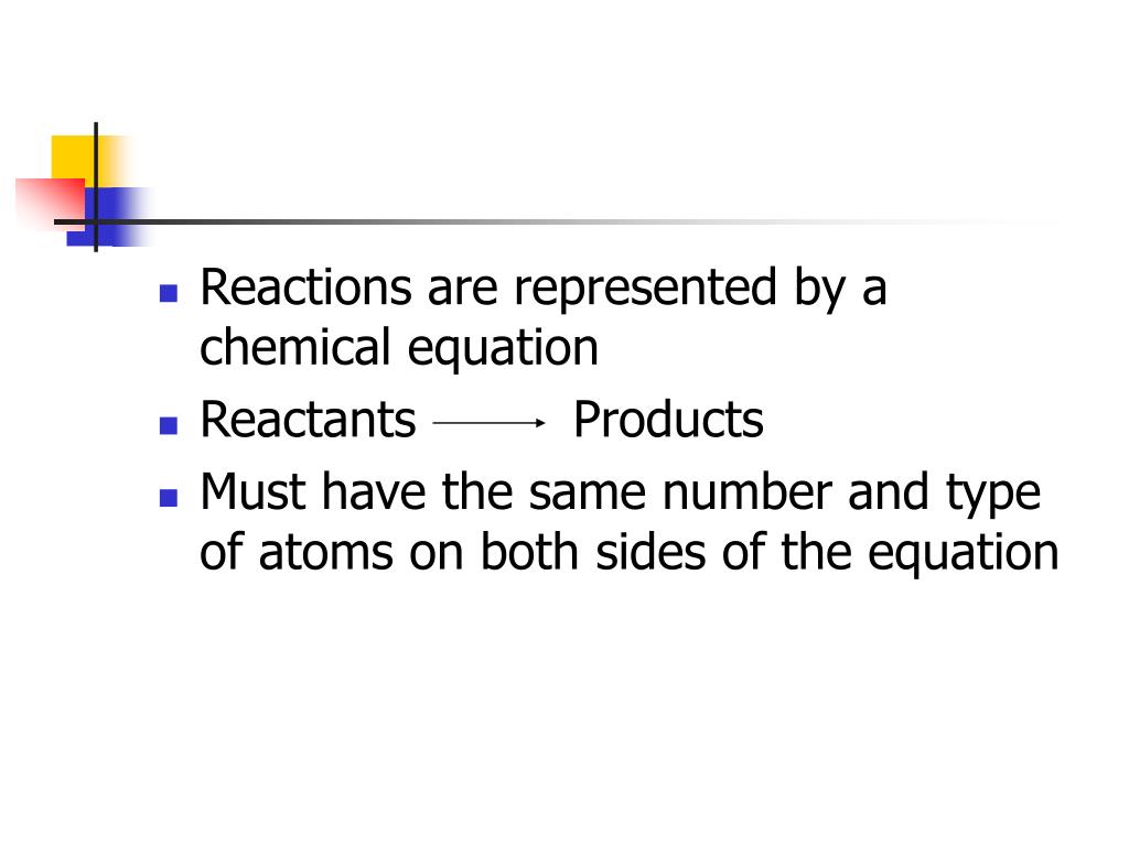 Reactions are represented by a chemical equation • Reactants Products • Must have the same number and type of atoms on both sides of the equation