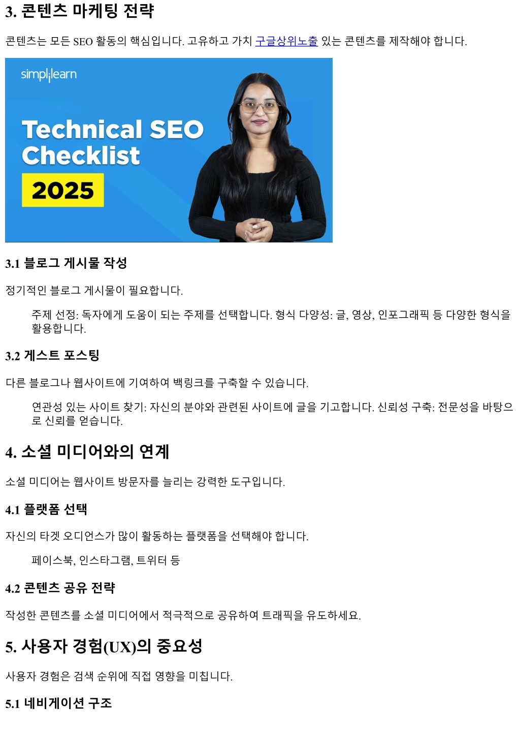 3. 콘텐츠마케팅전략 콘텐츠는모든 SEO 활동의핵심입니다. 고유하고가치구글상위노출있는콘텐츠를제작해야합니다. 3.1 블로그게시물작성 정기적인블로그게시물이필요합니다. 주제선정: 독자에게도움이되는주제를선택합니다. 형식다양성: 글, 영상, 인포그래픽등다양한형식을 활용합니다. 3.2 게스트포스팅 다른블로그나웹사이트에기여하여백링크를구축할수있습니다. 연관성있는사이트찾기: 자신의분야와관련된사이트에글을기고합니다. 신뢰성구축: 전문성을바탕으 로신뢰를얻습니다. 4. 소셜미디어와의연계 소셜미디어는웹사이트방문자를늘리는강력한도구입니다. 4.1 플랫폼선택 자신의타겟오디언스가많이활동하는플랫폼을선택해야합니다. 페이스북, 인스타그램, 트위터등 4.2 콘텐츠공유전략 작성한콘텐츠를소셜미디어에서적극적으로공유하여트래픽을유도하세요. 5. 사용자경험(UX)의중요성 사용자경험은검색순위에직접영향을미칩니다. 5.1 네비게이션구조