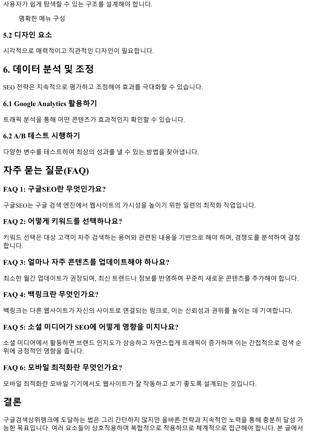 사용자가쉽게탐색할수있는구조를설계해야합니다.사용자가쉽게탐색할수있는구조를설계해야합니다. 명확한메뉴구성 5.2 디자인요소 시각적으로매력적이고직관적인디자인이필요합니다. 6. 데이터분석및조정 SEO 전략은지속적으로평가하고조정해야효과를극대화할수있습니다. 6.1 Google Analytics 활용하기 트래픽분석을통해어떤콘텐츠가효과적인지확인할수있습니다. 6.2 A/B 테스트시행하기 다양한변수를테스트하여최상의성과를낼수있는방법을찾아냅니다. 자주묻는질문(FAQ) FAQ 1: 구글SEO란무엇인가요? 구글SEO는구글검색엔진에서웹사이트의가시성을높이기위한일련의최적화작업입니다. FAQ 2: 어떻게키워드를선택하나요? 키워드선택은대상고객이자주검색하는용어와관련된내용을기반으로해야하며, 경쟁도를분석하여결정 합니다. FAQ 3: 얼마나자주콘텐츠를업데이트해야하나요? 최소한월간업데이트가권장되며, 최신트렌드나정보를반영하여꾸준히새로운콘텐츠를추가해야합니다. FAQ 4: 백링크란무엇인가요? 백링크는다른웹사이트가자신의사이트로연결되는링크로, 이는신뢰성과권위를높이는데기여합니다. FAQ 5: 소셜미디어가 SEO에어떻게영향을미치나요? 소셜미디어에서활동하면브랜드인지도가상승하고자연스럽게트래픽이증가하며이는간접적으로검색순 위에긍정적인영향을줍니다. FAQ 6: 모바일최적화란무엇인가요? 모바일최적화란모바일기기에서도웹사이트가잘작동하고보기좋도록설계되는것입니다. 결론 구글검색상위랭크에도달하는법은그리간단하지않지만올바른전략과지속적인노력을통해충분히달성가 능한목표입니다. 여러요소들이상호작용하며복합적으로작용하므로체계적으로접근해야합니다. 본글에서