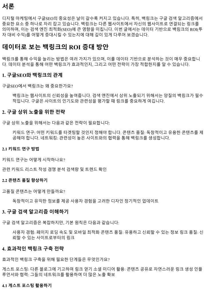 서론 디지털마케팅에서구글SEO의중요성은날이갈수록커지고있습니다. 특히, 백링크는구글검색알고리즘에서 중요한요소중하나로자리잡고있습니다. 백링크는다른웹사이트에서자신의웹사이트로연결되는링크를 의미하며, 이는검색엔진최적화(SEO)에큰영향을미칩니다. 이번글에서는데이터기반으로백링크의 ROI(투 자대비수익)를어떻게증대시킬수있는지에대해깊이있게다루어보겠습니다. 데이터로보는백링크의 ROI 증대방안 백링크를통해수익을늘리는방법은여러가지가있으며, 이를데이터기반으로분석하는것이매우중요합니 다. 데이터분석을통해어떤백링크가효과적인지, 그리고어떤전략이가장적합한지를알수있습니다. 1. 구글SEO와백링크의관계 구글SEO에서백링크는왜중요한가요? 백링크는웹사이트의신뢰성을높여줍니다. 검색엔진에서상위노출되기위해서는양질의백링크가필수 적입니다. 구글은사이트의인기도와관련성을평가할때링크를중요하게여깁니다. 2. 구글상위노출을위한전략 구글상위노출을위해서는다음과같은전략이필요합니다: 키워드연구: 어떤키워드를타겟팅할것인지정해야합니다. 콘텐츠품질: 독창적이고유용한콘텐츠를제 공해야합니다. 네트워킹: 관련성이높은사이트와의협력을통해백링크를생성합니다. 2.1 키워드연구방법 키워드연구는어떻게시작하나요? 관련키워드리스트작성경쟁분석검색량및트렌드확인 2.2 콘텐츠품질향상하기 고품질콘텐츠는어떻게만들까요? 독창적이고유익한정보를제공사용자경험을고려한디자인정기적인업데이트 3. 구글검색알고리즘이해하기 구글검색알고리즘은복잡하지만, 기본원칙은다음과같습니다: 사용자경험: 페이지로딩속도및모바일최적화콘텐츠품질: 유용하고신뢰할수있는정보링크품질: 신 뢰할수있는사이트로부터의링크 4. 효과적인백링크구축전략 효과적인백링크구축을위해필요한단계들은무엇인가요? 게스트포스팅: 다른블로그에기고하여링크얻기소셜미디어활용: 콘텐츠공유로자연스러운링크생성인플 루언서와협력: 그들의네트워크를활용하여더많은노출확보 4.1 게스트포스팅활용하기