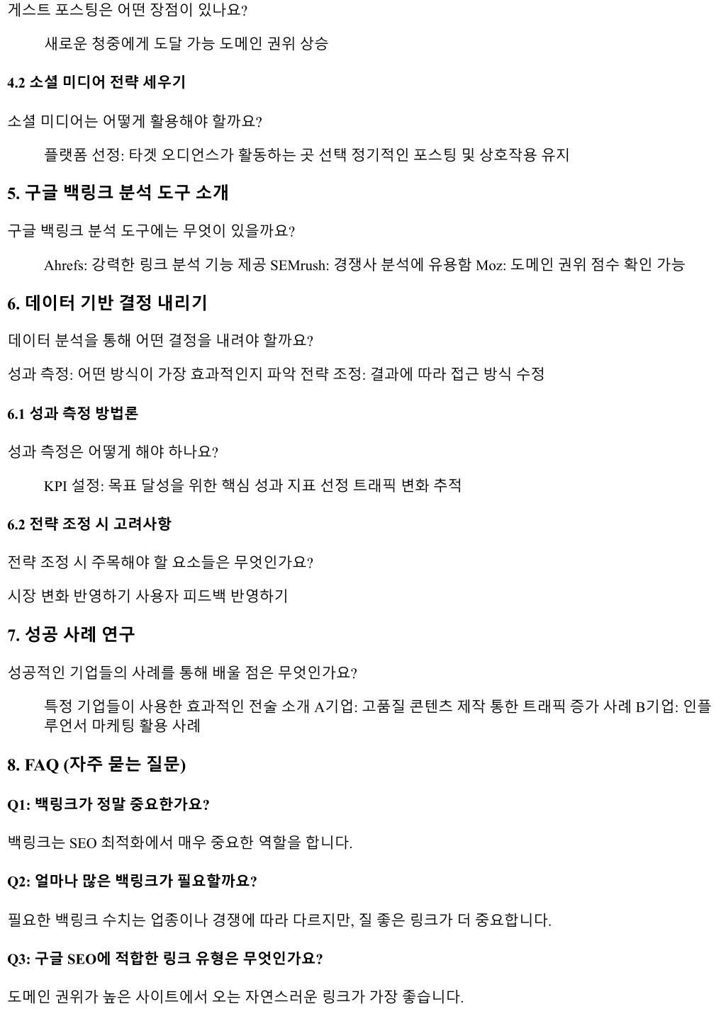 게스트포스팅은어떤장점이있나요? 새로운청중에게도달가능도메인권위상승 4.2 소셜미디어전략세우기 소셜미디어는어떻게활용해야할까요? 플랫폼선정: 타겟오디언스가활동하는곳선택정기적인포스팅및상호작용유지 5. 구글백링크분석도구소개 구글백링크분석도구에는무엇이있을까요? Ahrefs: 강력한링크분석기능제공 SEMrush: 경쟁사분석에유용함 Moz: 도메인권위점수확인가능 6. 데이터기반결정내리기 데이터분석을통해어떤결정을내려야할까요? 성과측정: 어떤방식이가장효과적인지파악전략조정: 결과에따라접근방식수정 6.1 성과측정방법론 성과측정은어떻게해야하나요? KPI 설정: 목표달성을위한핵심성과지표선정트래픽변화추적 6.2 전략조정시고려사항 전략조정시주목해야할요소들은무엇인가요? 시장변화반영하기사용자피드백반영하기 7. 성공사례연구 성공적인기업들의사례를통해배울점은무엇인가요? 특정기업들이사용한효과적인전술소개 A기업: 고품질콘텐츠제작통한트래픽증가사례 B기업: 인플 루언서마케팅활용사례 8. FAQ (자주묻는질문) Q1: 백링크가정말중요한가요? 백링크는 SEO 최적화에서매우중요한역할을합니다. Q2: 얼마나많은백링크가필요할까요? 필요한백링크수치는업종이나경쟁에따라다르지만, 질좋은링크가더중요합니다. Q3: 구글 SEO에적합한링크유형은무엇인가요? 도메인권위가높은사이트에서오는자연스러운링크가가장좋습니다.