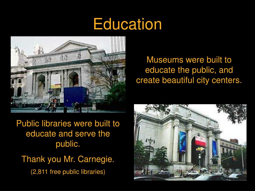 Education Museums were built to educate the public, and create beautiful city centers. Public libraries were built to educate and serve the public. Thank you Mr. Carnegie. (2,811 free public libraries)