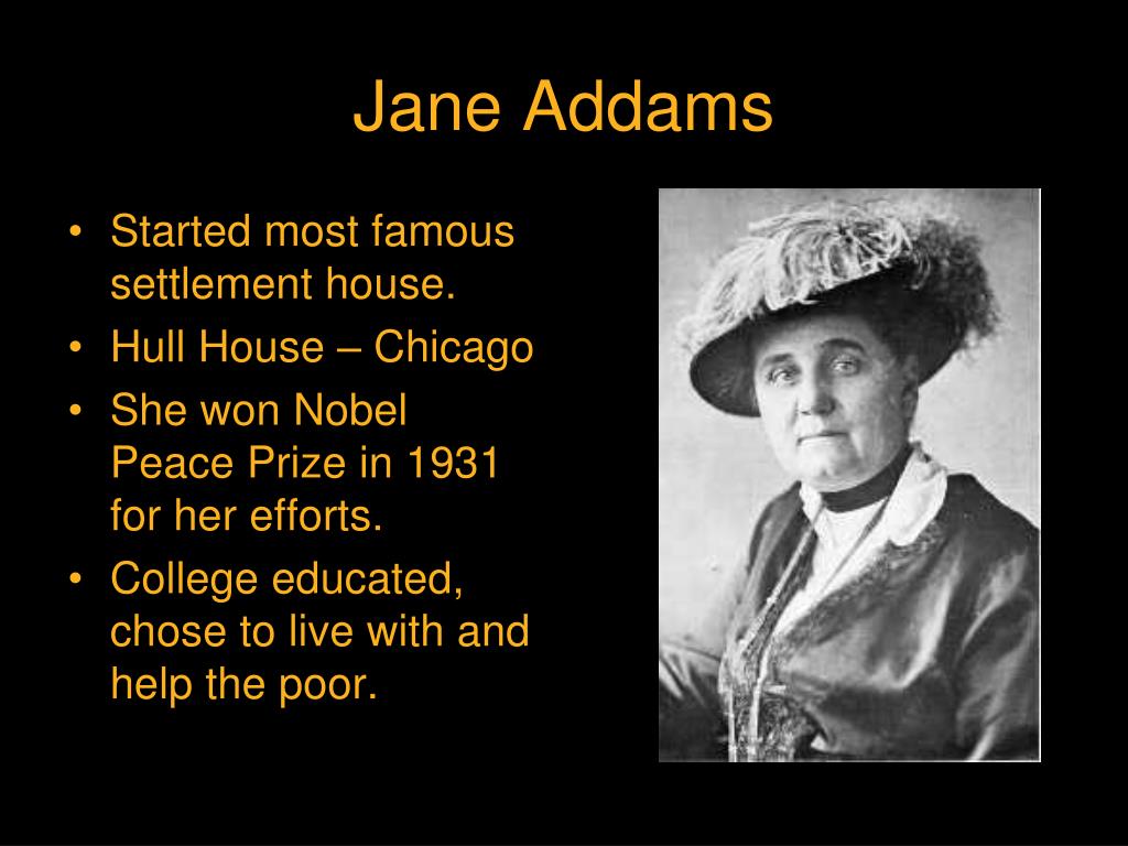 Jane Addams • Started most famous settlement house. • Hull House – Chicago • She won Nobel Peace Prize in 1931 for her efforts. • College educated, chose to live with and help the poor.
