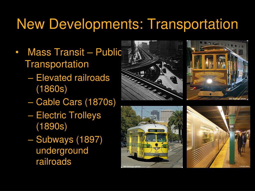 New Developments: Transportation • Mass Transit – Public Transportation • Elevated railroads (1860s) • Cable Cars (1870s) • Electric Trolleys (1890s) • Subways (1897) underground railroads