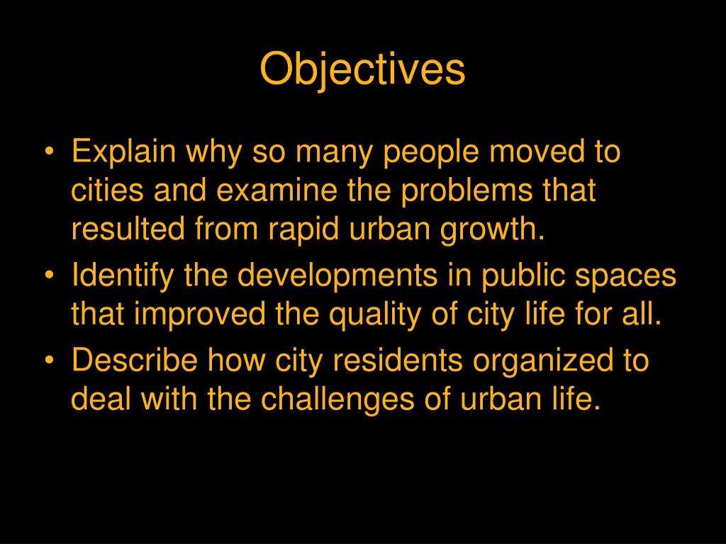 Objectives • Explain why so many people moved to cities and examine the problems that resulted from rapid urban growth. • Identify the developments in public spaces that improved the quality of city life for all. • Describe how city residents organized to deal with the challenges of urban life.